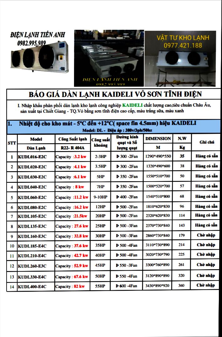 Công ty Tiến Anh nhập khẩu trực tiếp dàn lạnh , dàn nóng Kaideli phân phối tại thị trường Việt Nam cho các nhà thầu kho lạnh , sản phẩm Kaideli đạt tiêu chuẩn chất lượng châu Âu