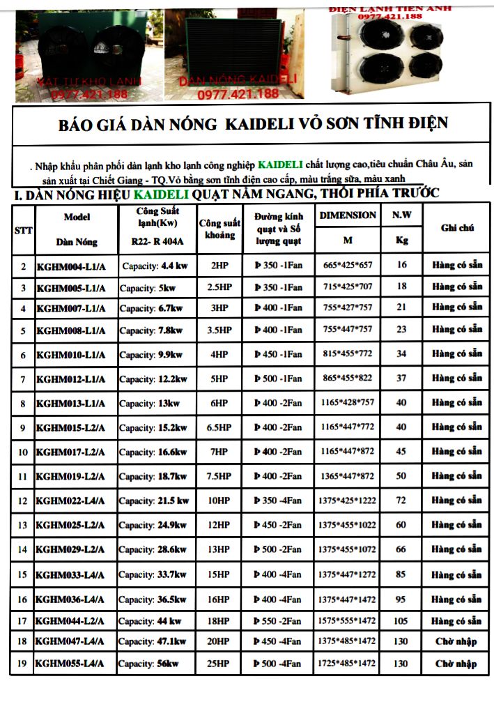 Công ty Điện Lạnh Tiến Anh chuyên Nhập khẩu, cung cấp và phân phối sản phẩm Dàn lạnh công nghiệp KAIDELI tại Hà Nội và các tỉnh thành trên toàn quốc. Dàn nóng Kaideli Model KGHM phù hợp sử dụng trong các hệ thống các kho lạnh, kho, hầm cấp đông, trữ đông, kho bảo quản có công suất vừa và lớn được sản xuất tại Thượng Hải -Trung Quốc theo dây chuyền công nghệ hiện đại Châu Âu, được nhập khẩu nguyên đai nguyên kiện, có đầy đủ giấy chứng nhận CO, CQ, giá cả phải chăng, và được bảo hành theo chính sách nhà máy.